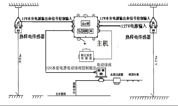 用于煤礦井上、井下粉塵濃度較大的作業(yè)場所,實現(xiàn)粉塵超標時的噴霧降塵。當有過往行人通過噴霧區(qū)域停止噴霧灑水;行人通過灑水區(qū)域后,延時所設定的時間后,繼續(xù)噴霧降塵。系統(tǒng)功能和延時時間可用yao控器任意調節(jié)設置